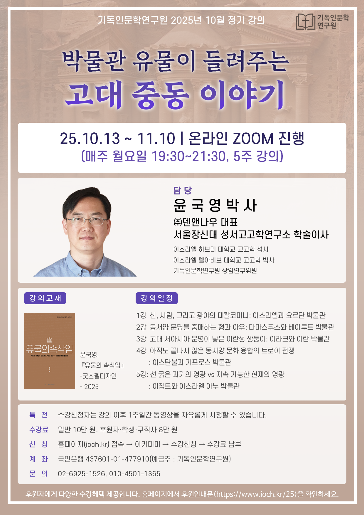 이스라엘 히브리대와 텔아비브대에서 고고학을 연구하신 윤국영 박사님이 박물관 속 유물의 이야기를 들려주십니다.