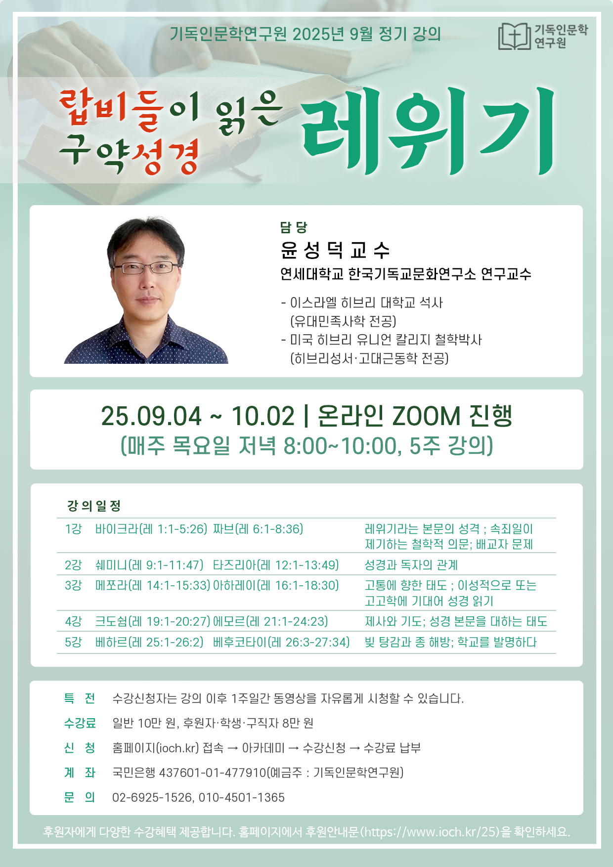 고대 근동학과 히브리 성서에 대한 독보적인 전문가 윤성덕 교수님이 강의를 이끌어 주십니다.
