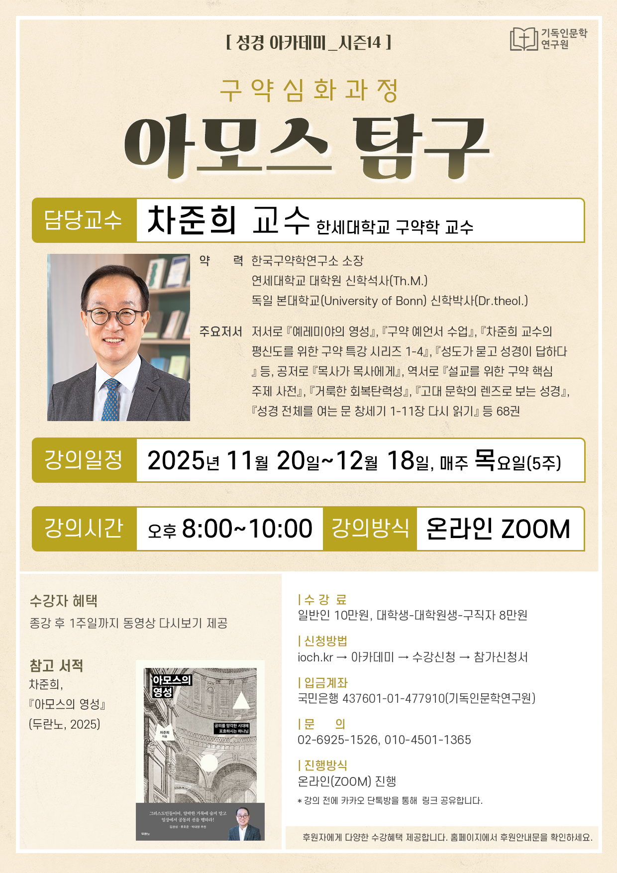 아모스서는 당시 시대상과 히브리어 원어를 알지 못하면 이해하기 까다로운 예언서입니. 차 교수님이 방대한 자료와 전문 서적을 연구하셨고, 이를 바탕으로 아모스의 신학적 언어를 대중의 눈높이에 맞춰 해설해 주실 것입니다. 신학생, 목회자뿐 아니라 일반 성도도 어렵지 않게 이해할 수 있는 강의가 될 것입니다.