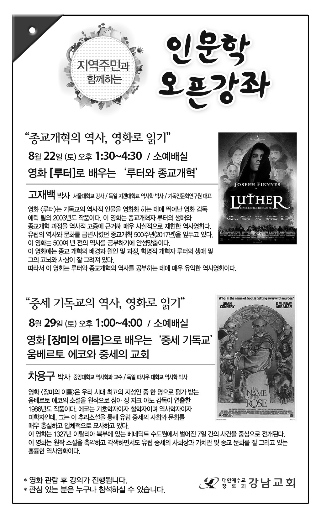 우리 연구원을 후원하고 있고 또한 여러 협력 활동을 진행하고 있는 강남교회(담임: 고문산 목사)에서 인문학 강좌가 개최됩니다.