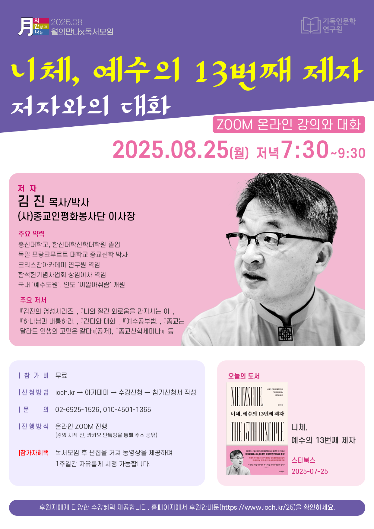 저자 김진 목사/박사님이 최신간 『니체, 예수의 13번째 제자』를 중심으로 강연하고, 참여자들이 자유롭게 질의 응답하며 토론하는 모임입니다.