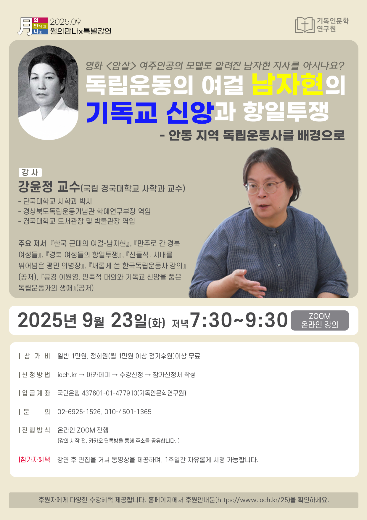 남자현 지사와 안동 지역 독립운동사의 전문가 강윤정 교수님을 모시고 남 지사의 민족애와 신앙을 배우고자 합니다.